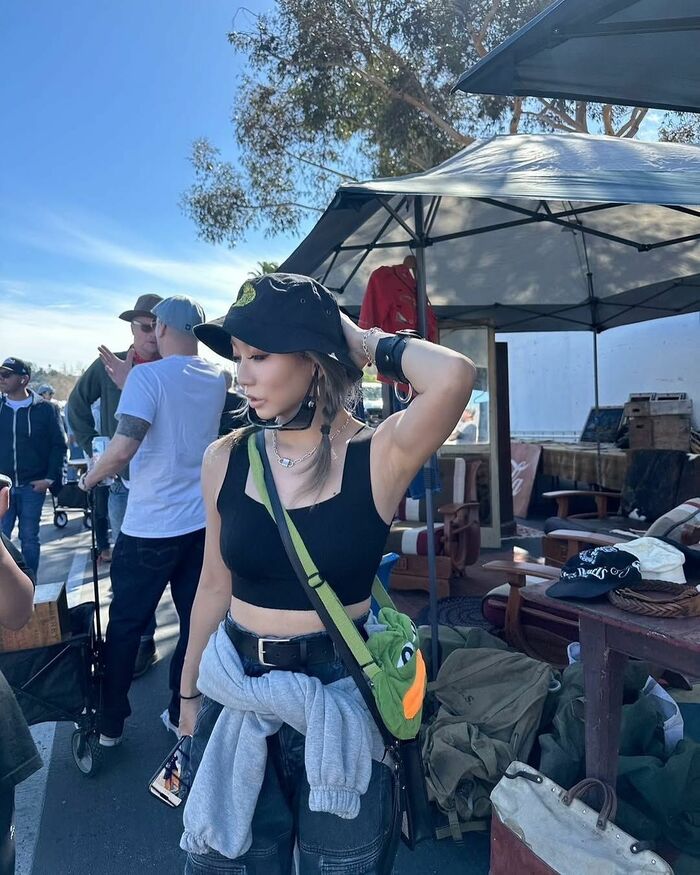 首まで着ていたパーカーを腰に巻いて、黒のバケットハットをかぶった姿も披露!