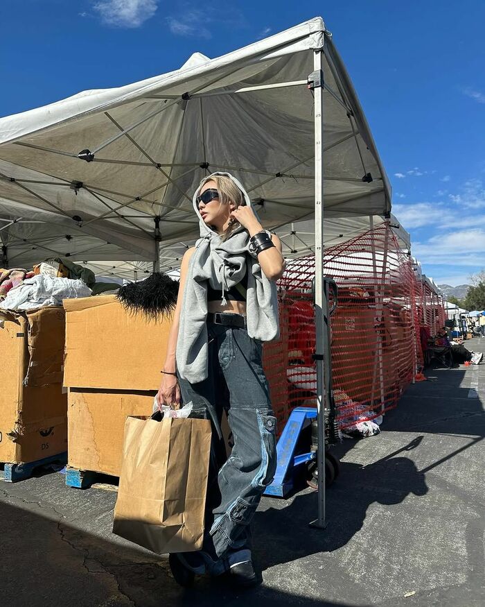 別の写真では、フリーマーケットで購入したのか、トップスがグレーのパーカーを首まで着て、フードをかぶったスタイルに変化しているのがわかります!