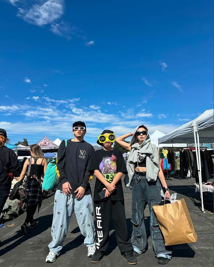 青空の下行われたフリーマーケットの通りで3人並んでポーズを決める姿からも、楽しそうな様子が伝わってきますね。