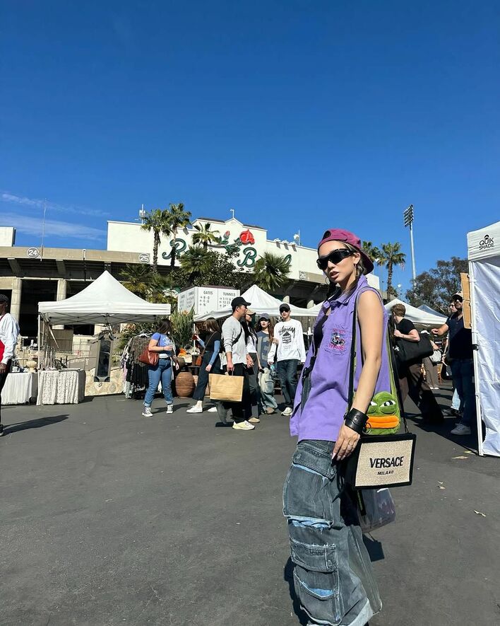 紫のノースリーブシャツとダボッとしたデニムパンツを合わせ、紫のキャップと特徴的な形のサングラスを身につけたコーディネートで、カジュアルなスタイルを披露しています。