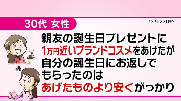 「親友の誕生日に1万円ほどのブランドコスメをプレゼントしたのに、お返しはハンカチとお菓子3つだけ。明らかに自分のほうが高価なものをあげていて、ガッカリ」という、30代女性のエピソードも登場しました。
