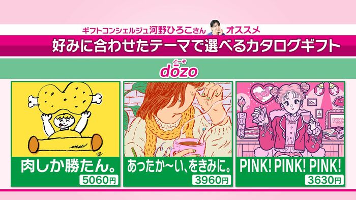 河野さんによると、最近は相手の好みに合わせたテーマのカタログを送ることができるカタログギフトが人気だといいます。
