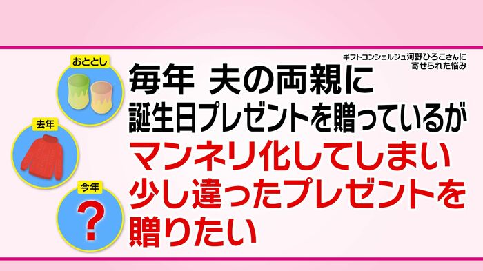 「夫の両親への誕生日プレゼントがマンネリ化して、困っている」という人には、河野さんが「体験型カタログギフト」を提案。