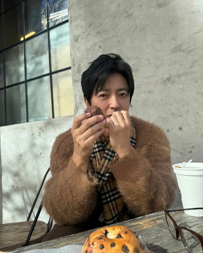 そこには、優しげなブラウンカラーのファー素材のアウターを羽織り、同じくブラウンカラーのチェック柄マフラーを巻いた、まるで“チョコカラーコーデ”に。手にはチョコレートがコーティングされたパンのようなものを持ち、カメラに向かって差し出すようにも見えます…!まるで一緒にシェアしているような感覚になっちゃいますね。