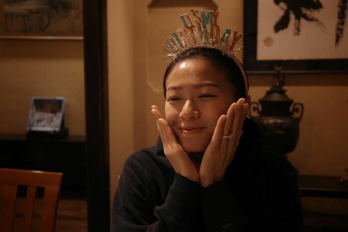別の写真では、お祝いをしてもらった喜びが伝わってくるご機嫌な榮倉さんの横顔も。