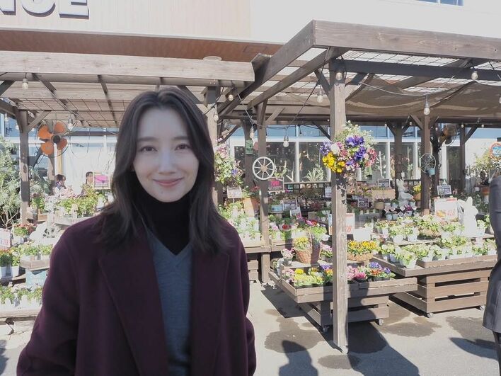 撮影の合間、色とりどりの花々をバックにカメラに向かって優しく微笑む波瑠さんの姿が!