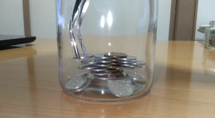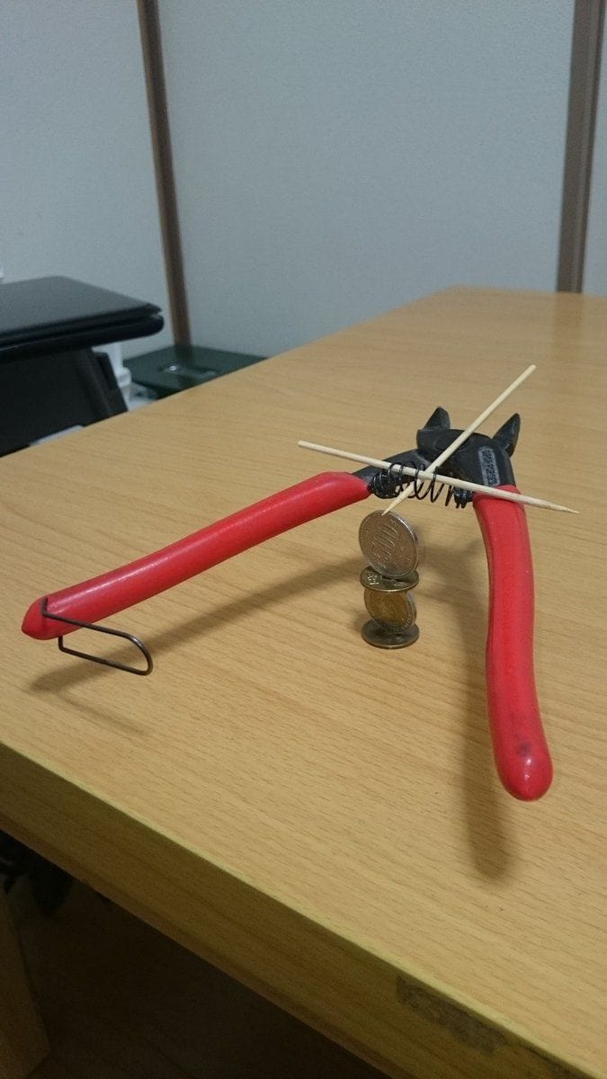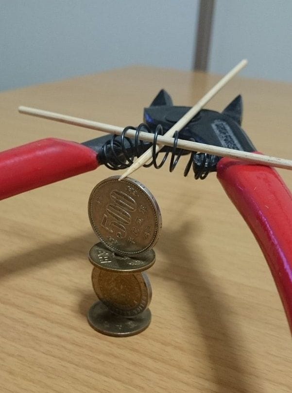 4枚のコインの上に、竹串を通したペンチがバランス良くのっていることが分かります。しかし、その事実が分かったところで、極めて信じがたい光景です。