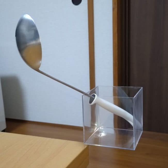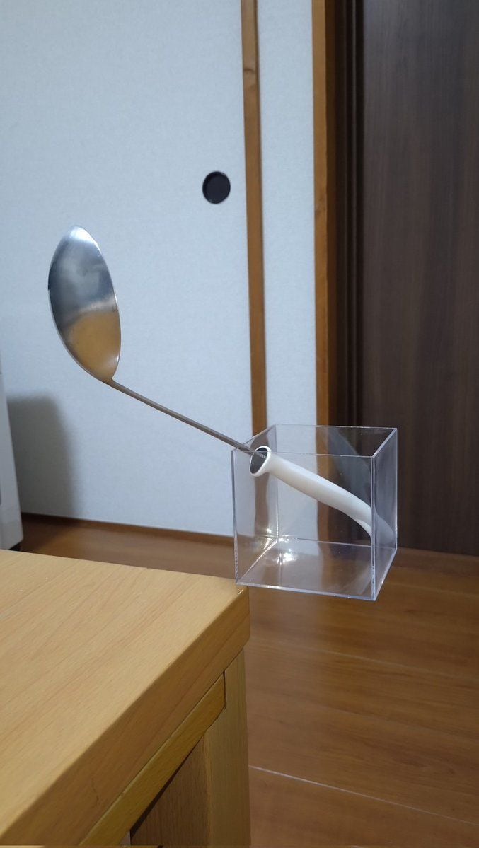 話題になっているのは、おたまが入った透明な箱をテーブルの角ギリギリに置いたバランスオブジェ。