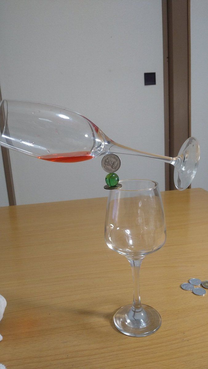 例えば、グラスの上にコインを横にのせ、その上にビー玉、さらにコインを縦に積み、その上にグラスを斜めにのせた、絶妙なバランスを保っている作品や・・・。