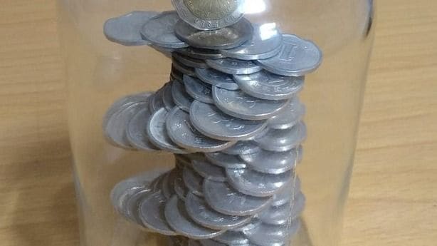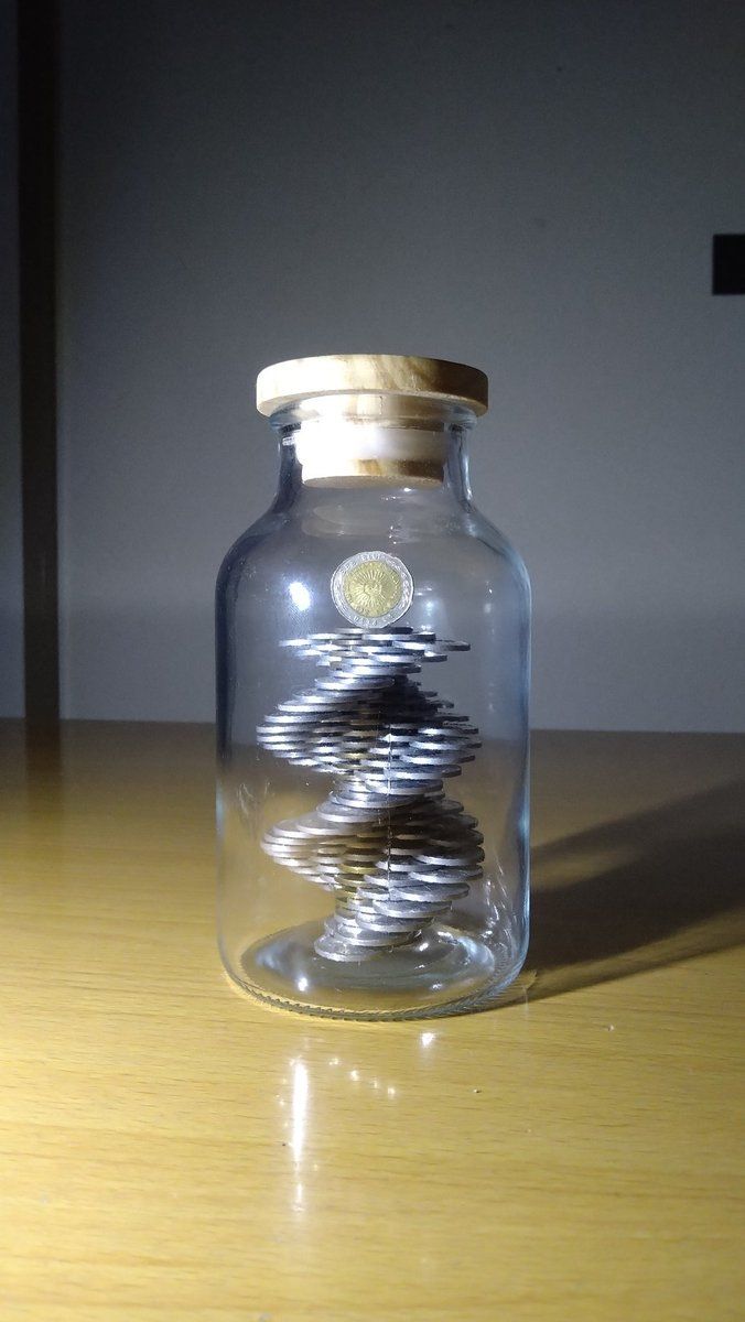 そんな「た ぬ」さんのお気に入りは、コインをビンの中にらせん状に積み上げた作品。