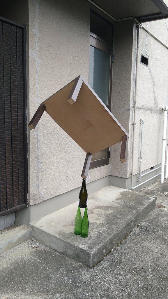 他にも、積み重ねた3本のビンの上に、どデカいテーブルをのせたものに・・・。