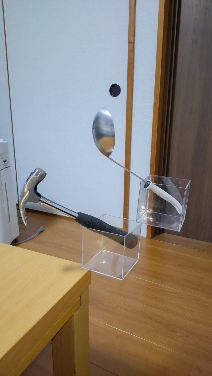 そこには、またまた机の端ギリギリのところにハンマーが入った透明の箱の上に、さらに、おたまが入った透明の箱が!
