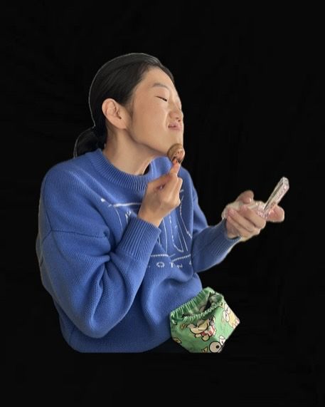 公開された写真を見てみると、青のニット姿で髪を一つにまとめたスタイルの横澤さんが、右手に持ったブラシでファンデーションを塗っている姿が!