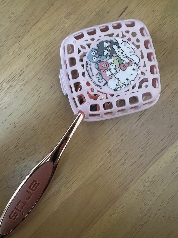 別の写真では、「ファンデブラシのケースが売ってなくて探してたら ダイソーに売ってたお弁当ピック入れがちょうどよかったのよー!」とつづり、ブラシを100円ショップで購入したお弁当用ピックのケースに入れるという新しい方法を披露していました。