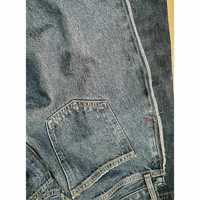 公開された写真を見てみると、まち針で仮止めされている完成前のデニムパンツの写真が。