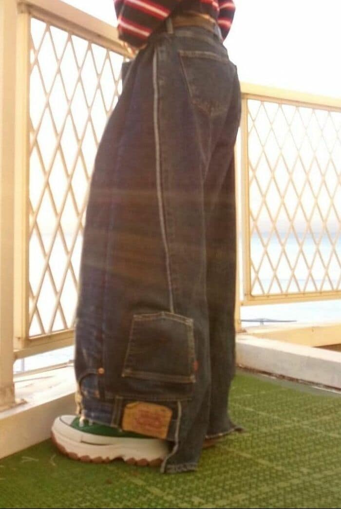 さらに、リメイクしたデニムパンツをよく見てみると、2本のデニムが逆さまに合わさって縫われていて、まるでデニムパンツを上下反対にはいているような裾が大きく広がったデザインになっているのが分かります!