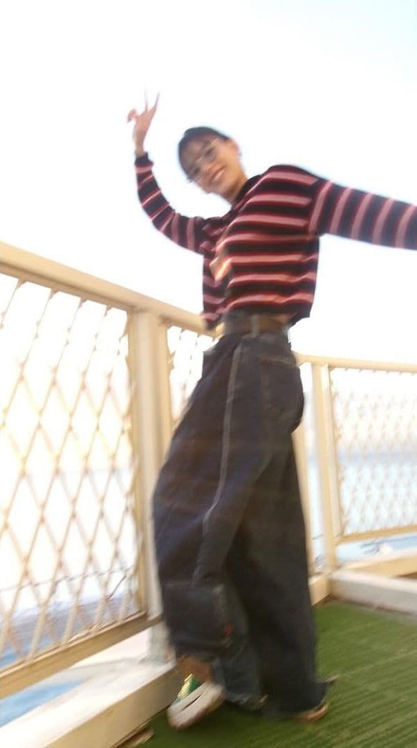 ダボッとした濃いブルーのデニムパンツに赤とネイビーのボーダーシャツを着たカジュアルなスタイルで、うれしそうな表情を見せながらカメラに向かってピースをしています。