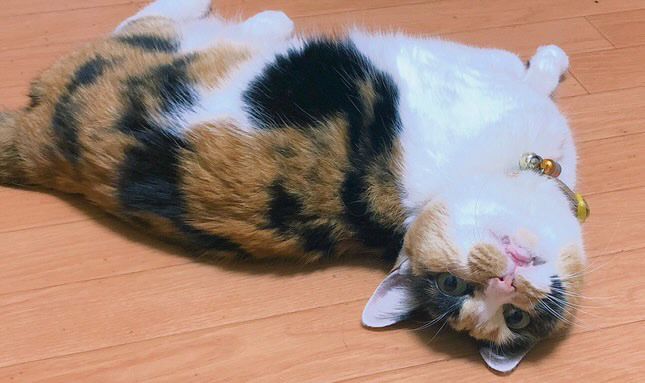 床に寝そべりながらこちらを見つめるのは、15歳の三毛猫「りんりん」ちゃん。普段からお利口さんなようですが、構われたくないにも関わらず、いつも皆んなの事が気になるツンデレな性格です。