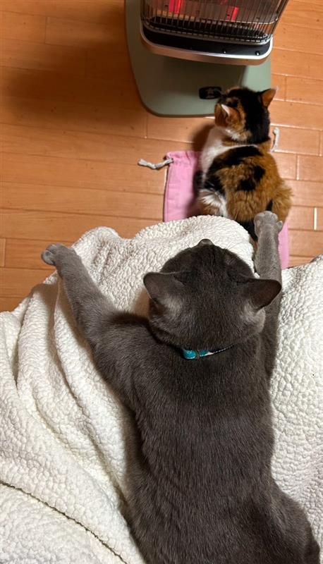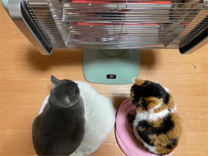 普段の様子を見ると、ストーブの前で温まり中のりんりんちゃんを、ソファの上からじっと見つめるルナちゃんの姿を見ることができます。
