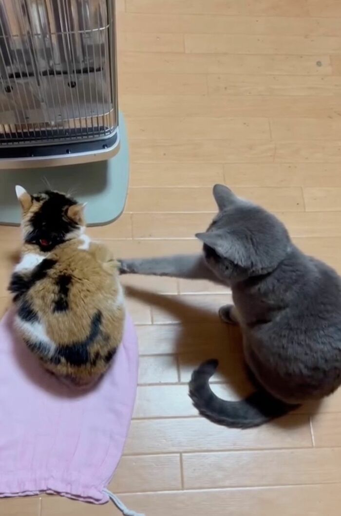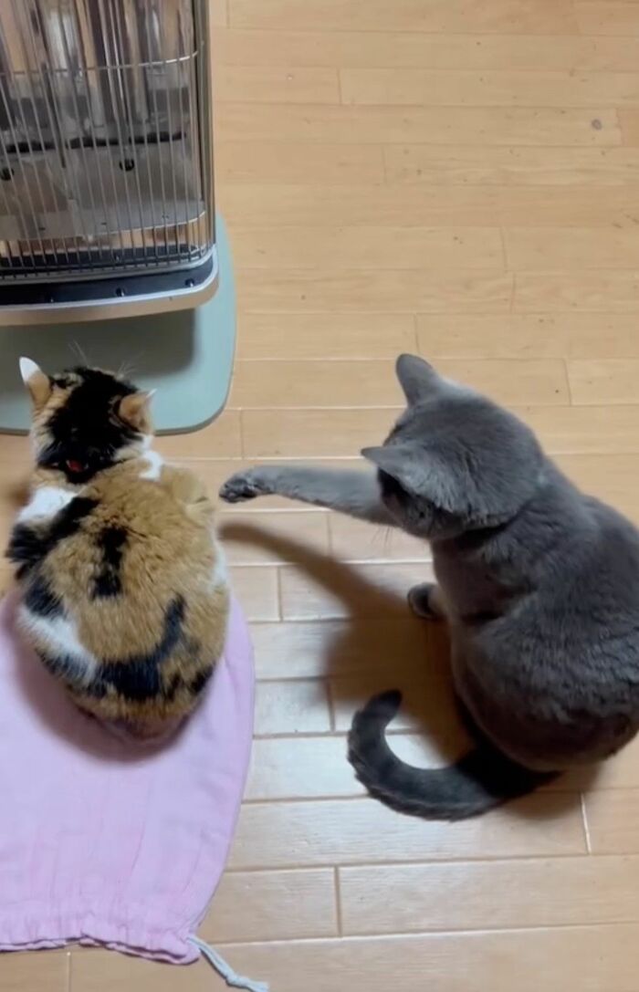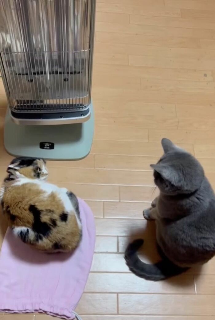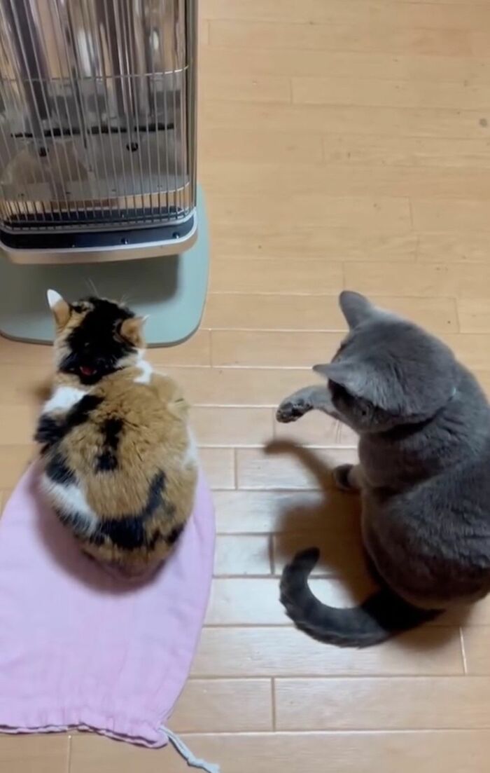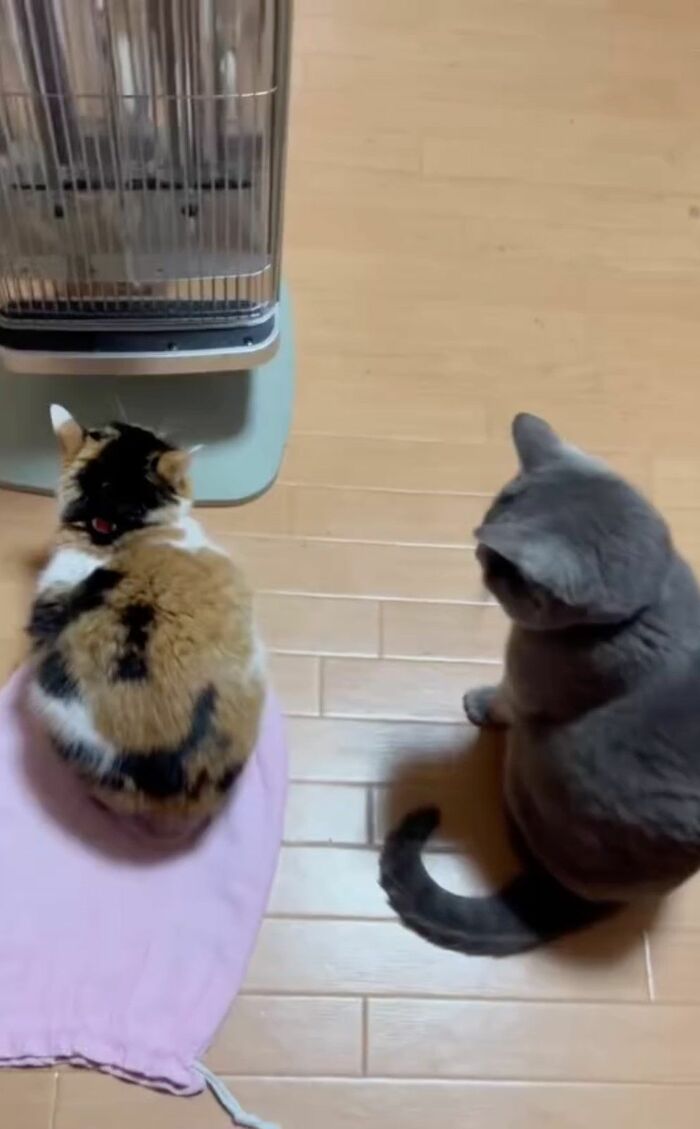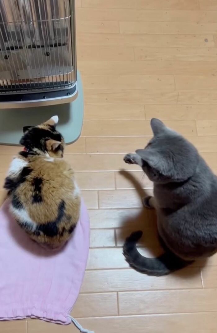 今回話題になったのは「ちょこっと触っただけなのに」とつづりアップされた、ストーブの前に座るりんりんちゃんとルナちゃんの動画。