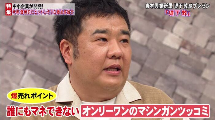 爆売れポイント:11年半『はねるのトびら』(フジテレビ)に出演。若手のころは「東の天才ツッコミ」と言われた。誰にもマネできないオンリーワンのマシンガンツッコミ。キャスターアリタの右腕としてのコネクションも。