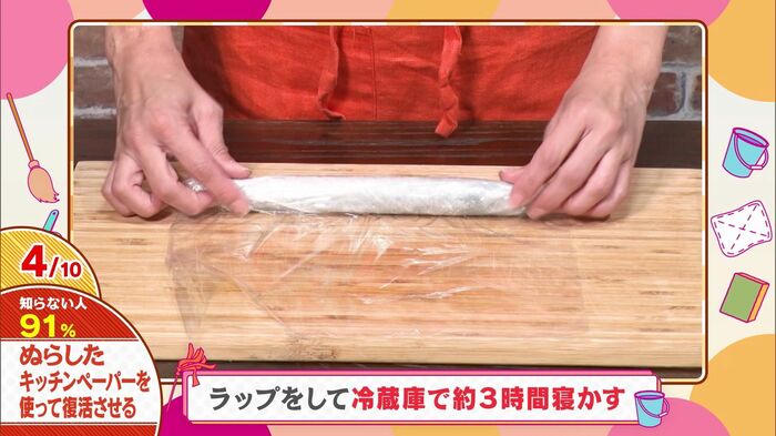 しなしなになったきゅうりに、水で濡らしたキッチンペーパーを巻きつけ・・・。