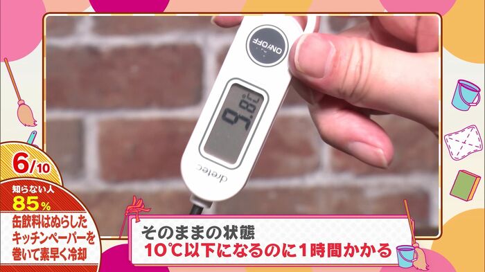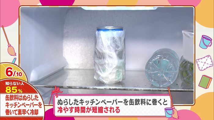 この方法が効果的な理由は、水分の気化熱を利用しているから。キッチンペーパーの水分が蒸発する際に、缶の熱を奪うんです。暑い夏の日、急な来客時にも大活躍間違いなしですよ。