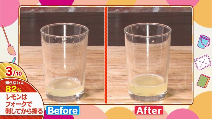 カットしたレモンの断面をフォークで数カ所刺してから絞るだけ。フォークで果肉を崩すことで、果汁がより多く出やすくなるんです。