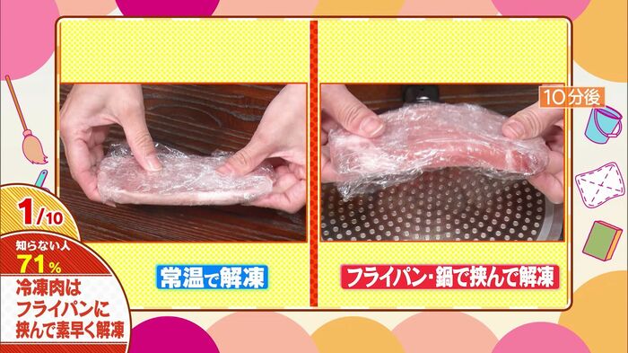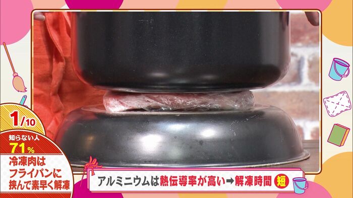 冷凍したお肉をラップで包み、アルミ製のフライパンで挟むだけ。たったの10分で、解凍が大幅に進むんです。