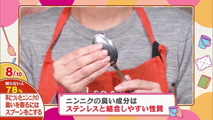 にんにくの臭いがついた手で、ステンレス製のスプーンを30秒ほどこすり洗いします。するとにんにくの臭いの原因である硫黄化合物が、ステンレスと結合して分解されるんです。その後、普通に手を洗えば、にんにくの臭いがスッキリ消えます。