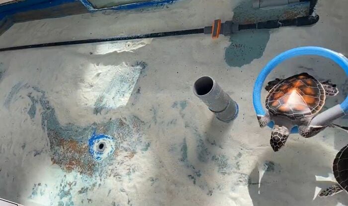 プールを上から撮影したタイムラプス映像を見てみても、他のアオウミガメが活発に泳いでいるにもかかわらず、一向に動く気配がなく、のんびりぷかぷか。