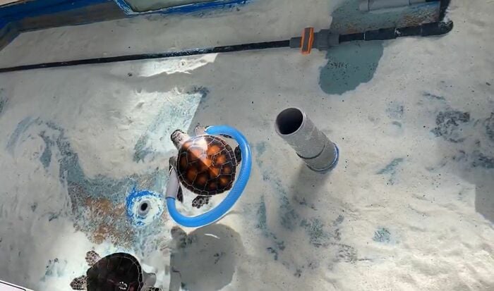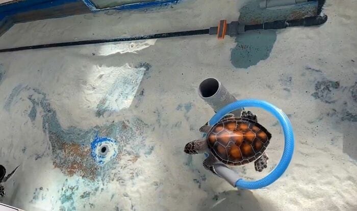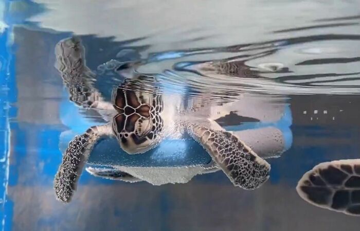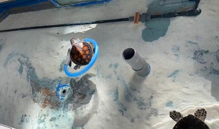 公開された動画を見てみると、アオウミガメが、青い浮輪に上手に両手を引っかけ、ぷかぷか水に浮いているではありませんか!