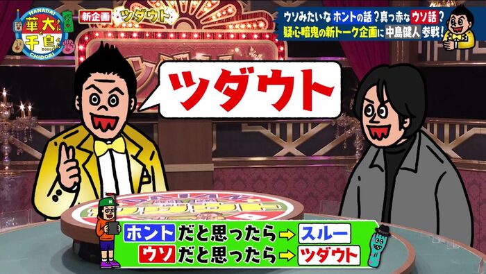 2月11日、『火曜は全力!華大さんと千鳥くん』が放送されました。今回は、ゲストに、中島健人さんを迎え、津田篤宏(ダイアン)さんが進行を務める冠企画「ツダウト」に挑戦。