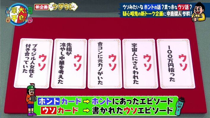 「ホント」だった場合は、プレイヤー8人が“だませた賞金”として3万円+スルーした「ウソ」カードの枚数×1万円を山分け(巧妙なトークで「ウソ」を何度も「スルー」させれば獲得賞金は増えていく)。