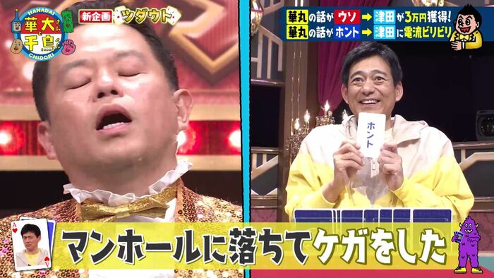 津田さんは「ありえへん!新聞載りまっせ!」と、自信たっぷりに「ツダウト」をコールするも「高校生のとき、飛び乗ったマンホールの蓋がズレていて、くるんと回りケガをした」という実話で失敗→電流ビリビリの罰ゲーム。