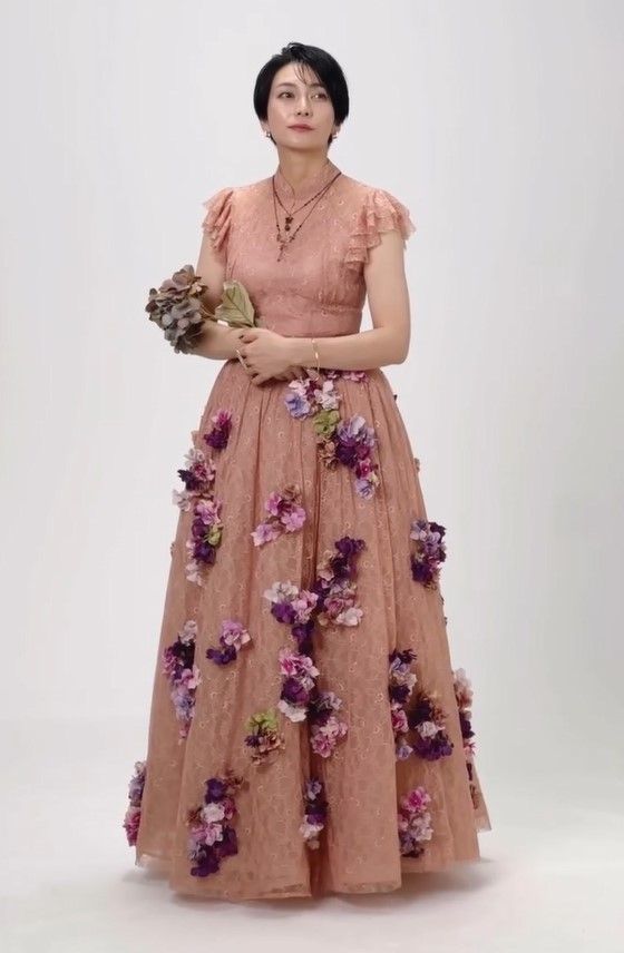 ピンクのレース素材のドレスに、裾にはピンクや紫の花がちりばめられたデザインの衣装姿で、アジサイを持ちながら真っすぐなまなざしでステージに立つ様子も。