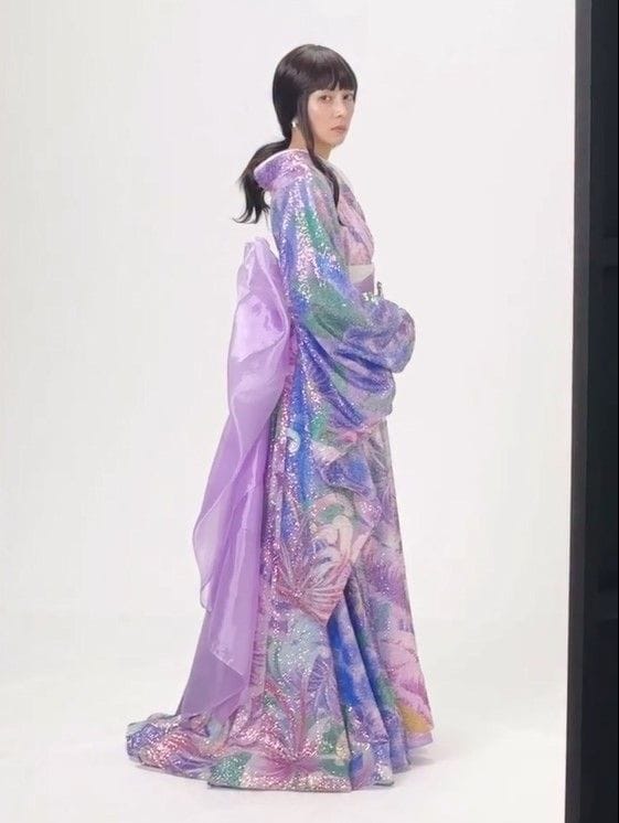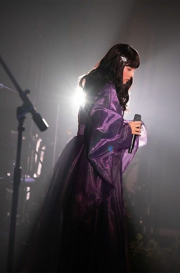 別の写真では、先ほどは髪の長さがショートだった柴咲さんがロングヘアになり、裾がふんわりと広がった紫の着物のような衣装姿に!