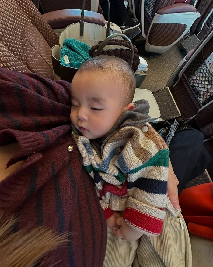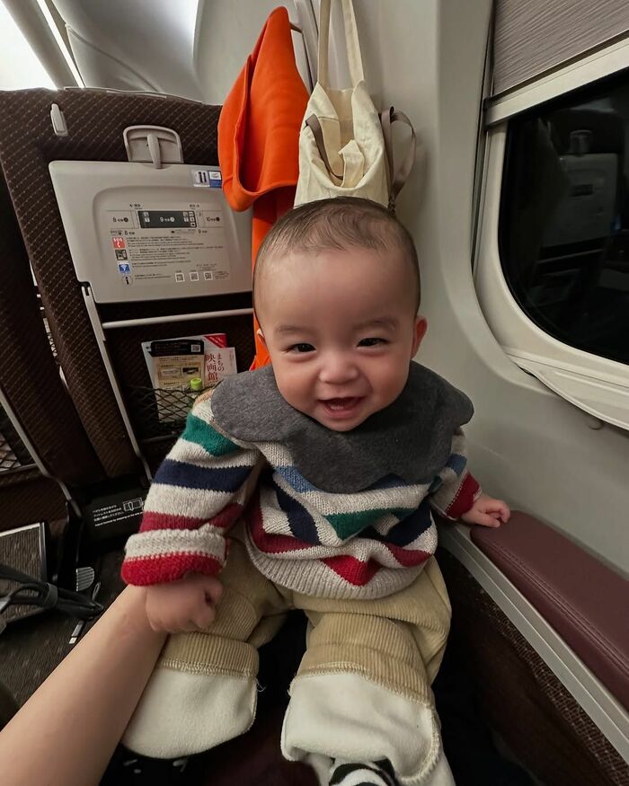 別の写真では、初めての新幹線に乗って、ご機嫌な表情を見せる長男の姿や…