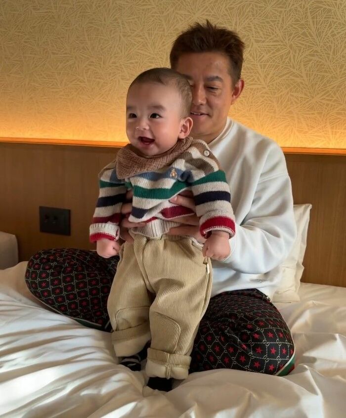 他にも、ベッドの上で井戸田さんに抱っこされながら、喜びをあらわにする“ベビバーグ”の姿も公開し、井戸田さんが息子にメロメロになっていることが伝わる家族団らんな様子を披露した蜂谷さん。