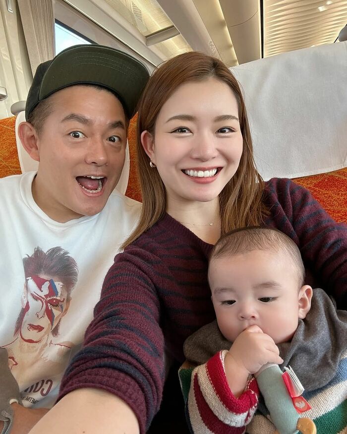 公開された写真には、新幹線の車内で席に座る蜂谷さんと井戸田さん、そして蜂谷さんの膝の上に座る“ベビバーグ”こと長男の3人の家族ショットが!