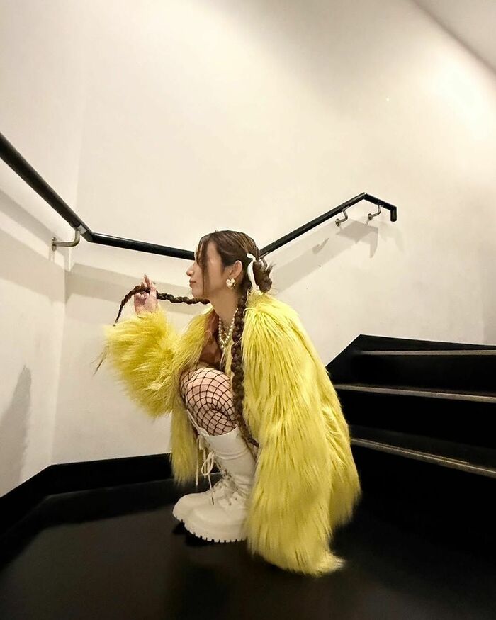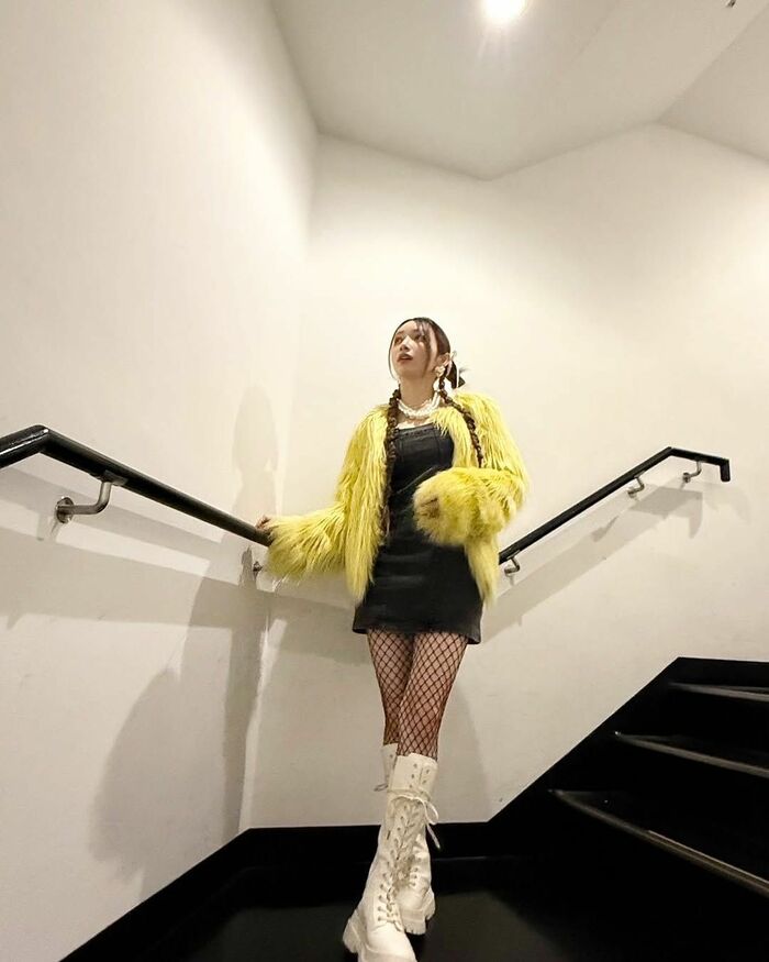 写真を見ると、ミニ丈ワンピースにイエローカラーのファージャケットを羽織り、網タイツに白のブーツを合わせたステージ衣装の後藤さんが。後藤さんは階段の手すりに手をかけ、ポーズをきめる姿や…。