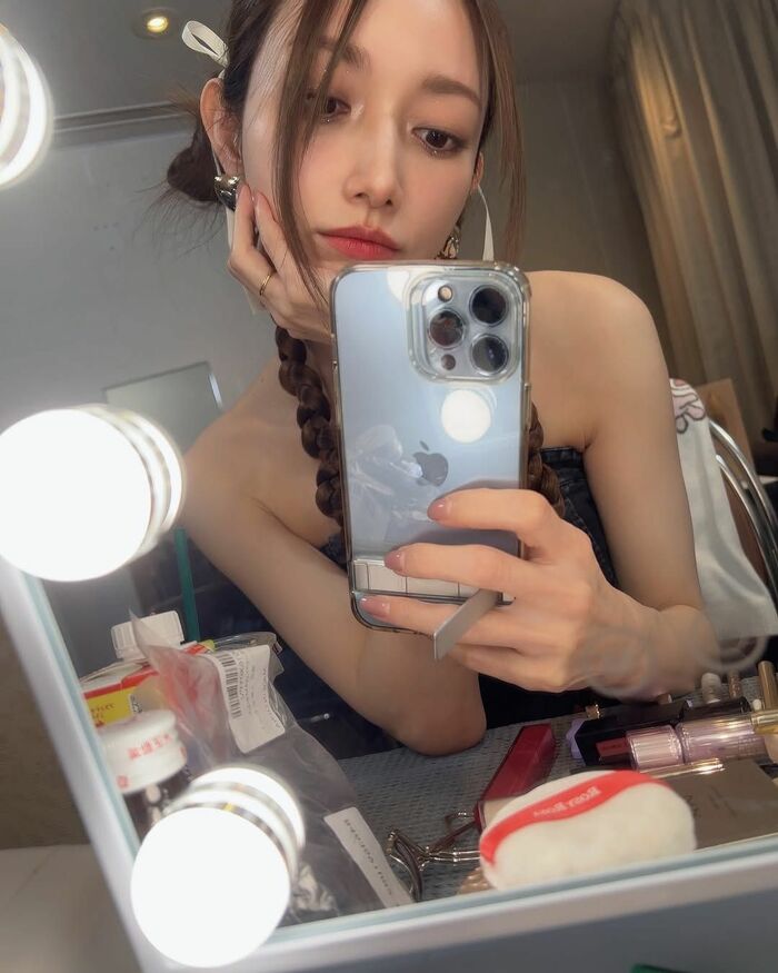 また、楽屋と思われる場所では、ジャケットを脱ぎ、“美肩”を披露した自撮りショットや…。