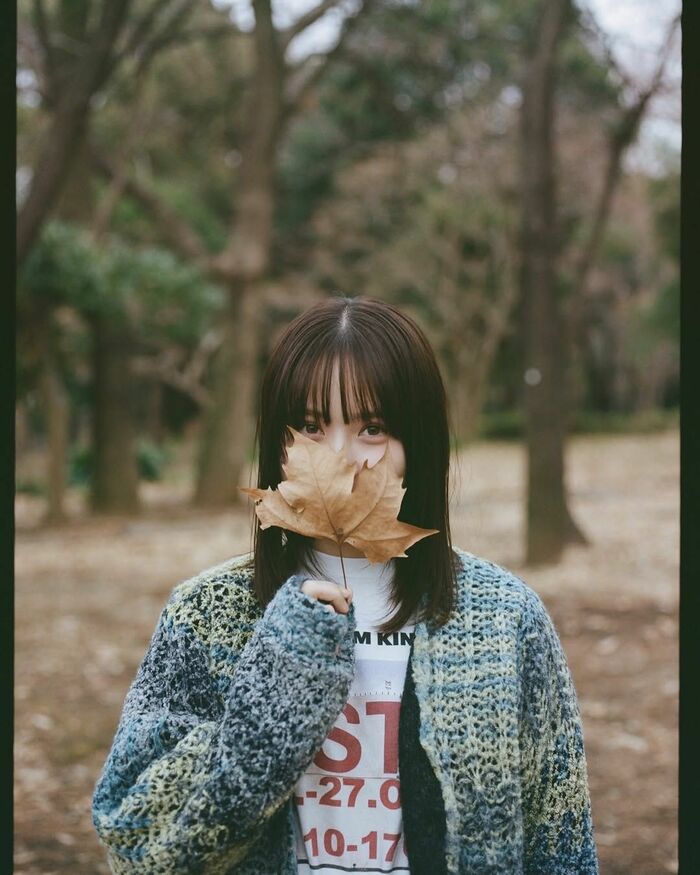 写真を見ると、淡いカラーのニットカーディガンを羽織ったコーデで、落ち葉を持ち、口元を隠す“おちゃめな”ポーズを披露しています。