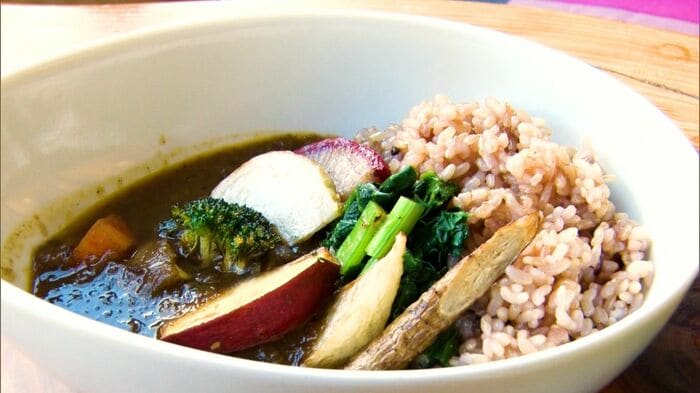 野菜からとったダシと、スパイスだけで作ったカレーで、具材は四季折々で変わる旬の揚げ野菜となっています。