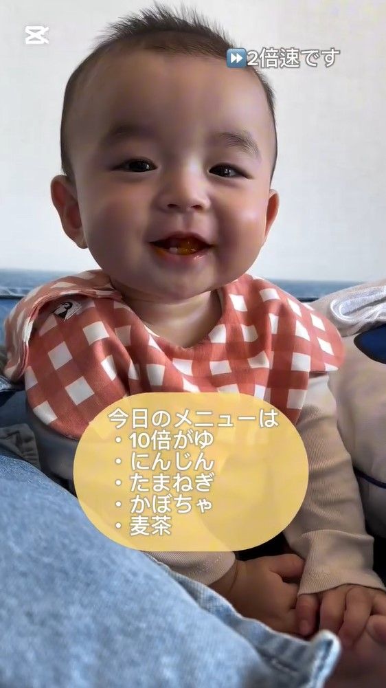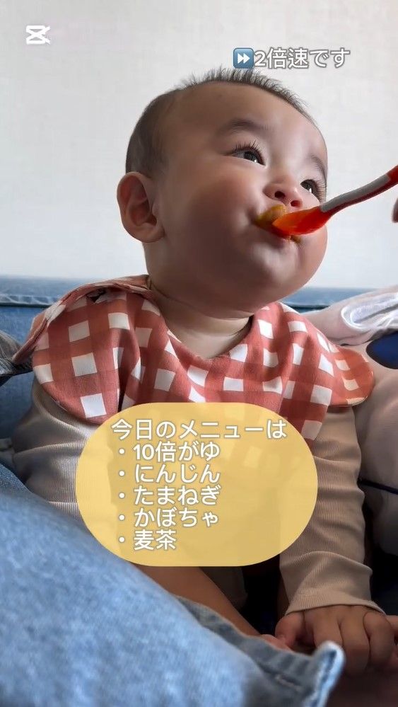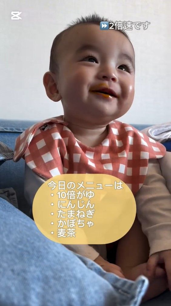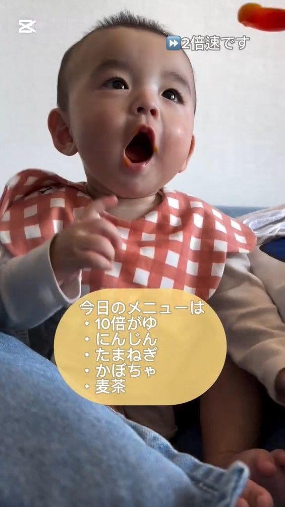 この日の離乳食は「10杯がゆ、にんじん、たまねぎ、かぼちゃ、麦茶」のお野菜たっぷりのメニュー。長男はかわいらしい笑顔でカメラを見つめ、ごはんの時間にウキウキの様子を見せます。