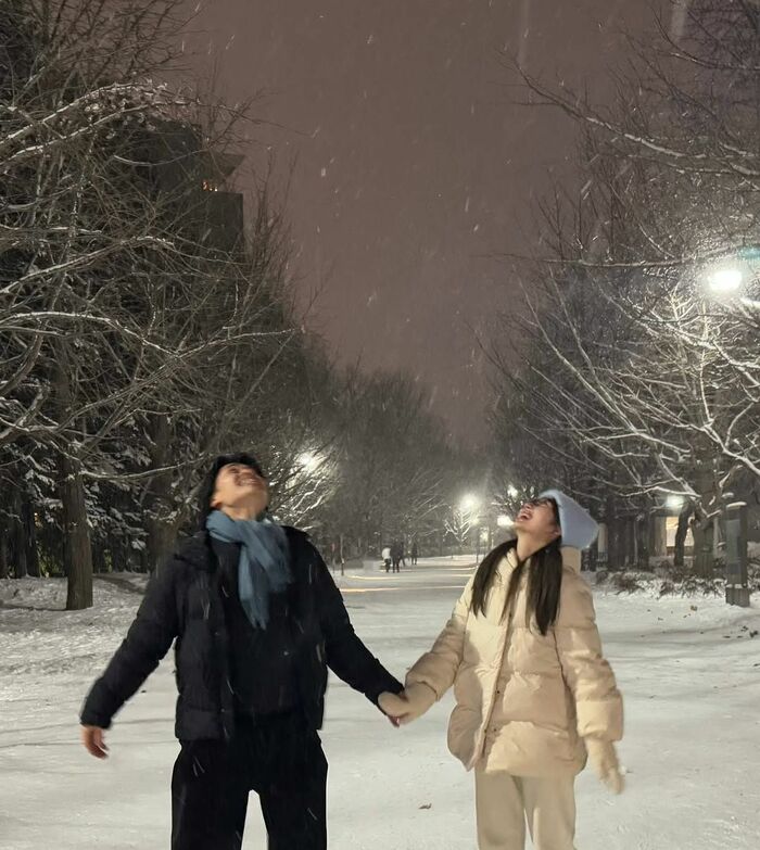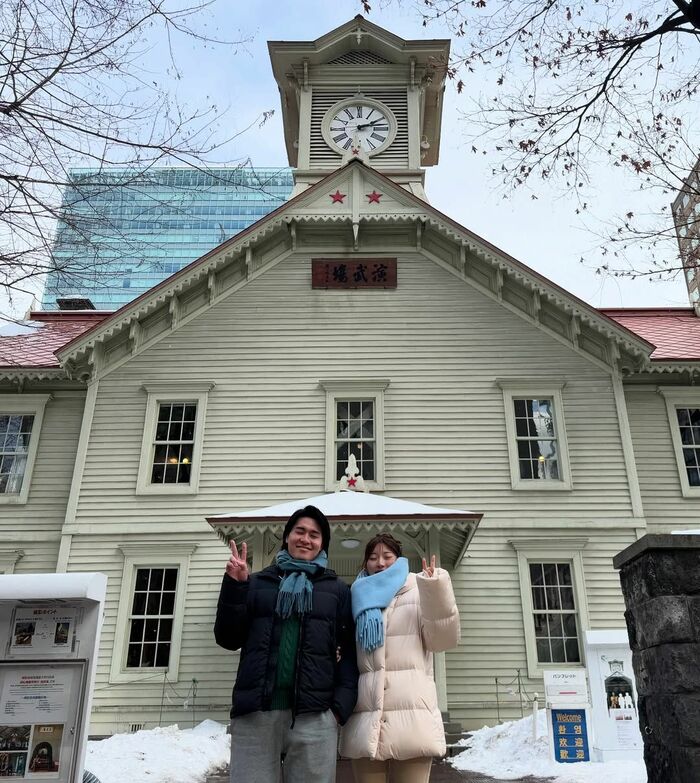 札幌市にある有名な観光地でも知られる時計台にも訪れたようで、2人がぴったりと寄り添いピースサインをする様子が!同じポーズをしていて、なんともほほ笑ましいショット。