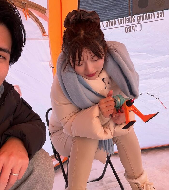 さらに、わかさぎ釣りもしたようで、真剣なまなざしで釣りをする、りこさんをたつやさんが撮影する様子が映し出されています。