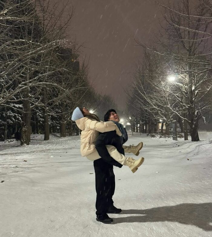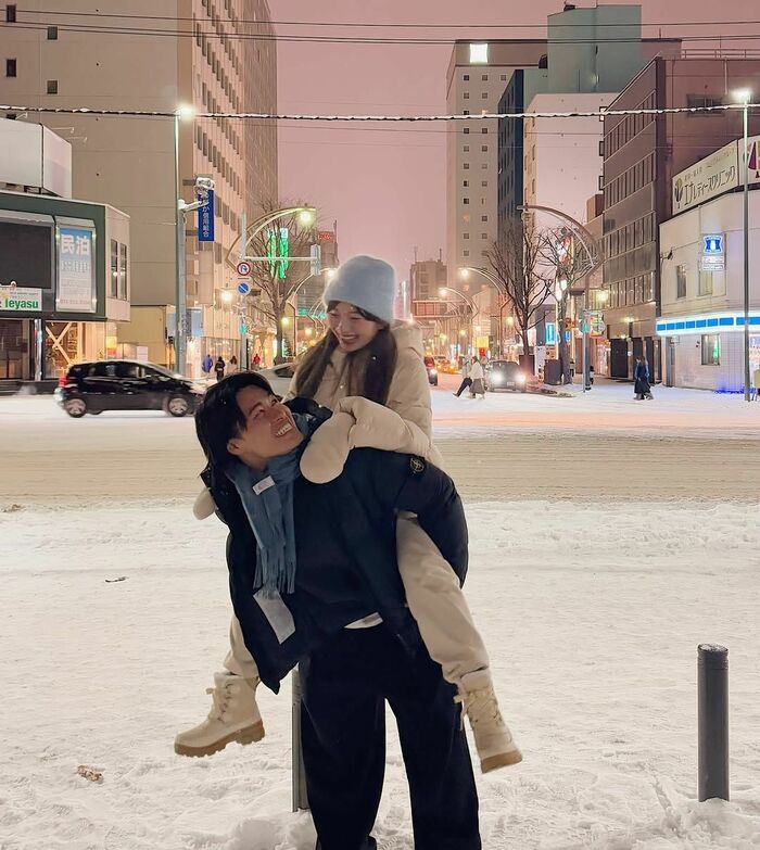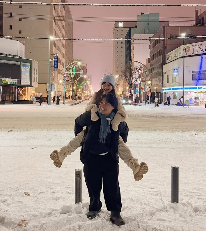 投稿された写真には、雪が積もった街中で、たつやさんにおんぶされる、りこさんの姿が!2人とも笑顔で楽しそうなのが伝わってきますね♪