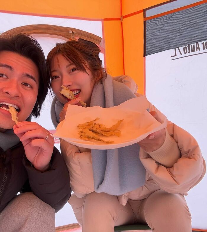 そして、わかさぎの天ぷらをパクッと食べるショットも!顔を寄せ合った笑顔の2人を見ると、釣りも楽しんだことがうかがえますね。