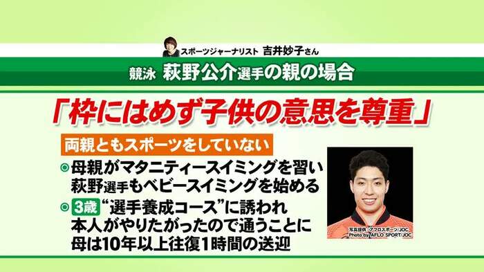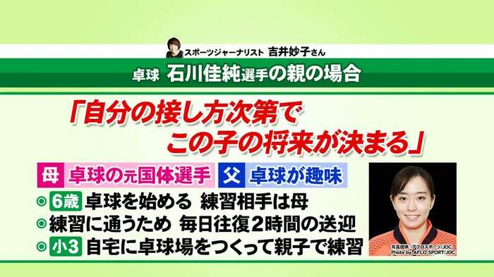 スポーツジャーナリストの吉井妙子氏によると、卓球の石川佳純選手も水泳の萩野公介選手も、競技の経験があるかどうかなど競技そのものへの親の関わり方の違いはあるにせよ、送迎のサポートは親が担当していたという。